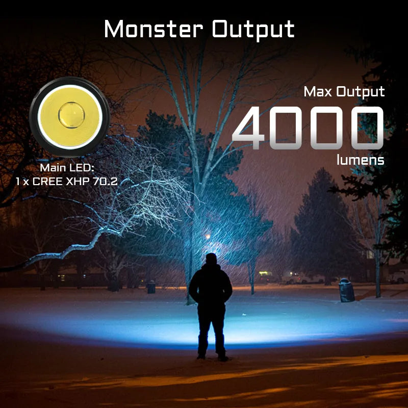 Max 4000 lumens powered by included 1x 21700 battery (IMR21700NP-510A)