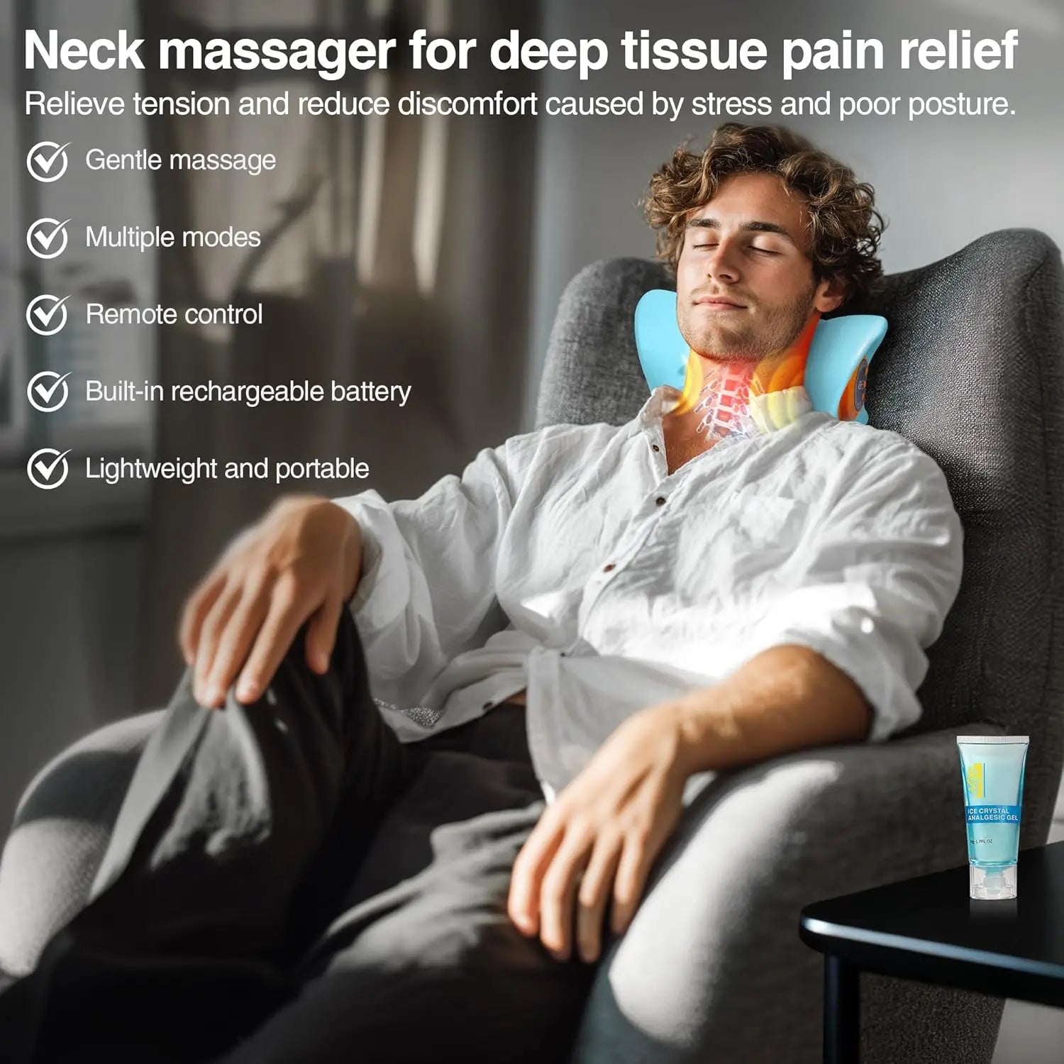 Experience deep cervical relaxation with our neck massager, designed to gently stretch tight muscles and alleviate stiffness. Ideal for those suffering from tech neck or poor posture due to long hours at a desk, it helps improve circulation and restore the natural curve of your neck. Enjoy customizable therapy with three modes that can be used separately or combined, allowing you to adjust intensity for optimal comfort. Just 15 minutes daily can lead to lasting relief and better sleep. This ergonomic massage pillow features a stable yet soft base contoured to fit the cervical spine at an optimal 26-degree angle. It corrects neck hump over time, maintains flexibility, and encourages healthy spinal alignment. Lightweight and portable, it comes with a rechargeable battery for use anywhere—at home, in the office, or on the go. The included remote control ensures easy operation without being plugged in. Perfect as a thoughtful gift for wellness enthusiasts, office workers, or athletes dealing with tension. Package includes the neck stretcher, soothing gel for added comfort (apply a small test first), Type-C charging cable, user manual, and remote control. Responsive customer support is available for any questions. Note: Fully charge before initial use; after turning on, remove plastic film from remote control bottom and point at device to operate.